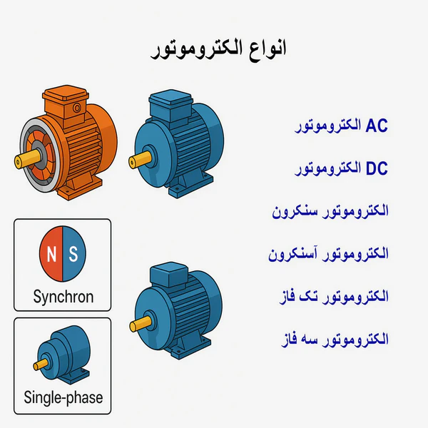 - موتور آسنکرون یا القایی: پرکاربردترین نوع الکتروموتور با طراحی ساده و قیمت مناسب.